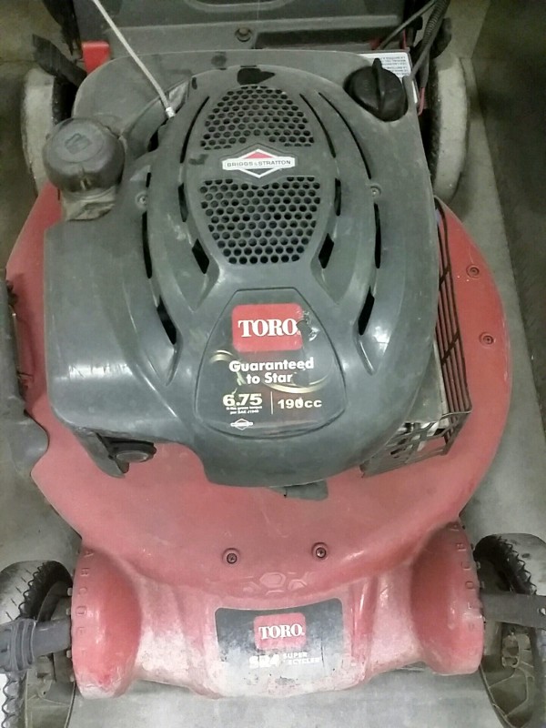 Description: 1 each Toro SR4 lawn mower. Recoil spins, but it's very tight.