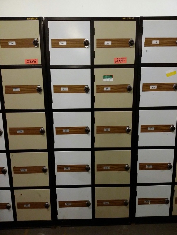 Description: 1 each ten bay unit bowling locker cabinet. Unit has no keys, or combinations to any of the ten locks.