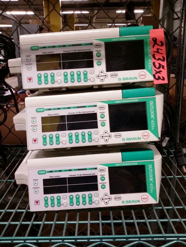 Description: Lot consisting of 3 each Braun Outlook 400es infusion IV pumps. These units were part of an upgrade and may, or may not function properly.
