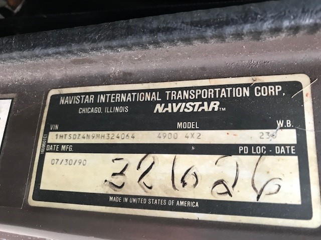 1991 International 4900 6 Cylinders 7.6L FI Turbo Diesel, Last known mileage 162,704 miles. Unknown engine, transmission, and brake condition. Rust present, flat tires,broken leaf springs, and damaged floors. May or may not have a battery. Scratches, dents, and rust may or may not be present. Normal dents, dings and scratches as consistent with vehicle age, mileage and use. Decal and sticker remants may or may not remain on paint. Rust may or may not appears on several areas around the vehicle. May or may not have undercarriage rust damage. Other small paint flaking and some surface rust may or may not be present. VEHICLE MAY OR MAY NOT NEED TO BE TOWED OFF SITE.