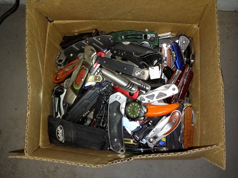 Description: 1 each 30lb box consisting of miscellaneous pocket knives.