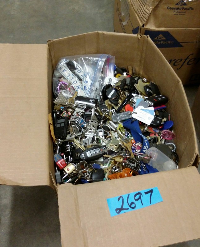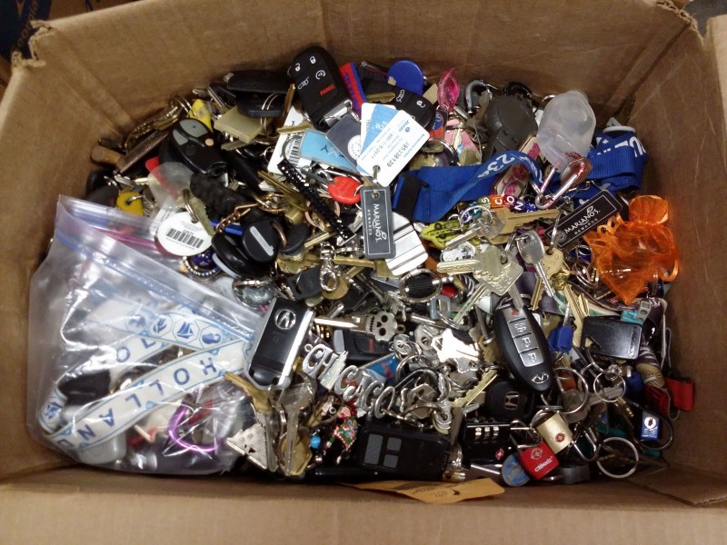 Description: 1 each box consisting of miscellaneous keys, key fobs, key rings, and other.