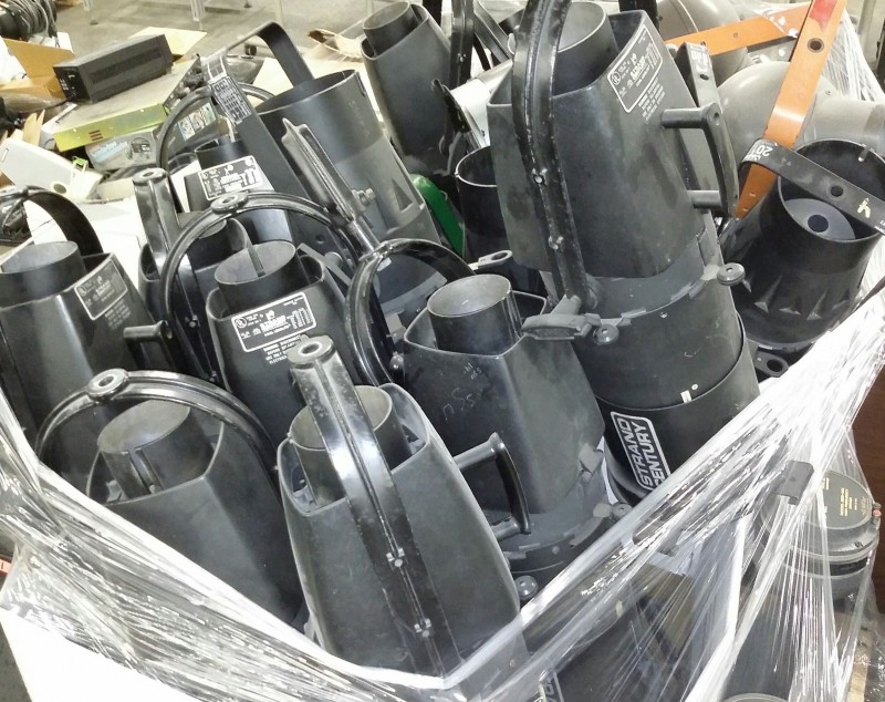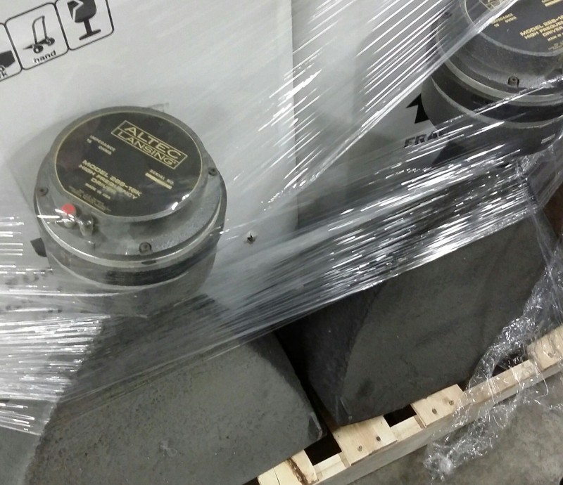 Description: 2 each boxes of stage light fixtures and 2 each Altech Lansing model 288-16K horn speakers.