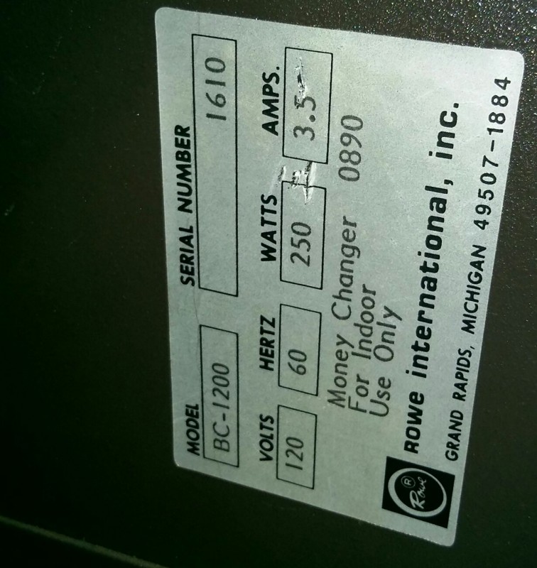 Description: 1 each Rowe model BC-1200 bill change machine for vending.