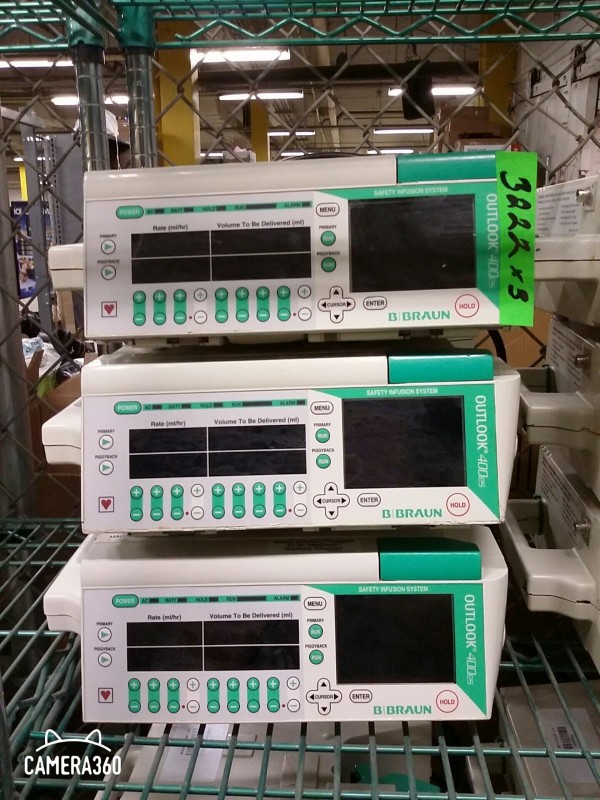Description: Lot consisting of 3 each Braun Outlook 400es infusion IV pumps. These units were part of an upgrade and may, or may not function properly.