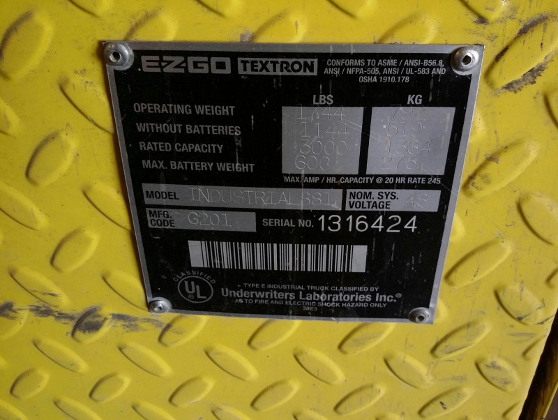 Description: 1 each Textron EZ-GO model 881 Industrial 48volt electric cart. This unit has a built in charger, but it is missing all of the batteries. Unit was taken out of service due to charging issues.