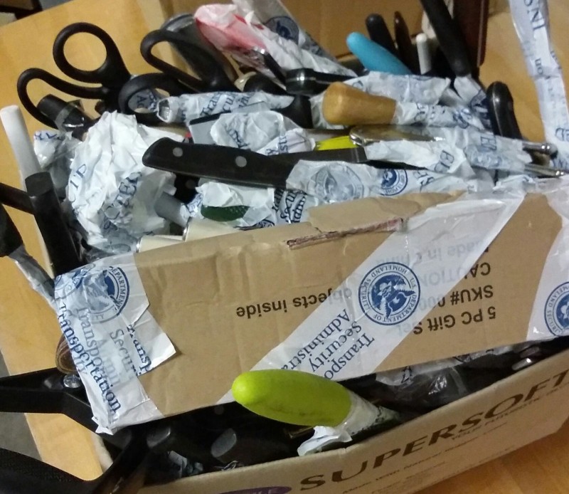 Description: 1 each box of unknown miscellaneous items. These items have TSA tape on them and could be pocket knives, kitchen utensils, tools, and other.
