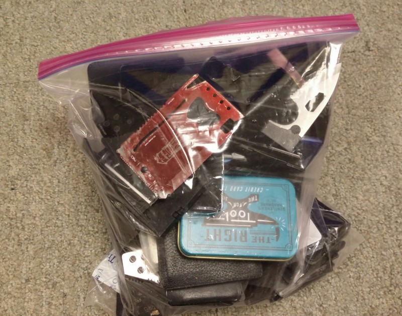 Description: 1 each gallon size Ziploc bag consisting of credit card knives and wallet multi-tools.