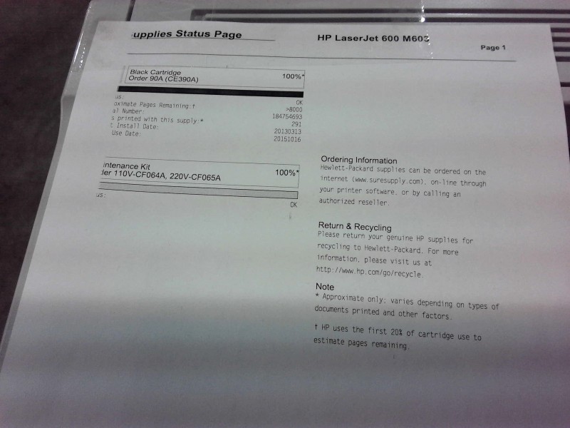Description: HP Laserjet 600 M603 printer - 1 each. See pictures for Supplies status page printout.