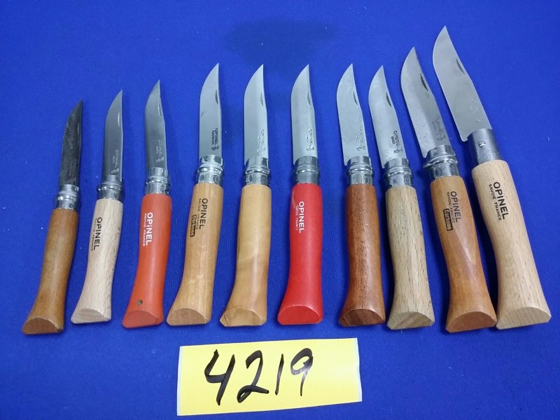 Description: Lot consisting of 10 each miscellaneous Opinel pocket knives.