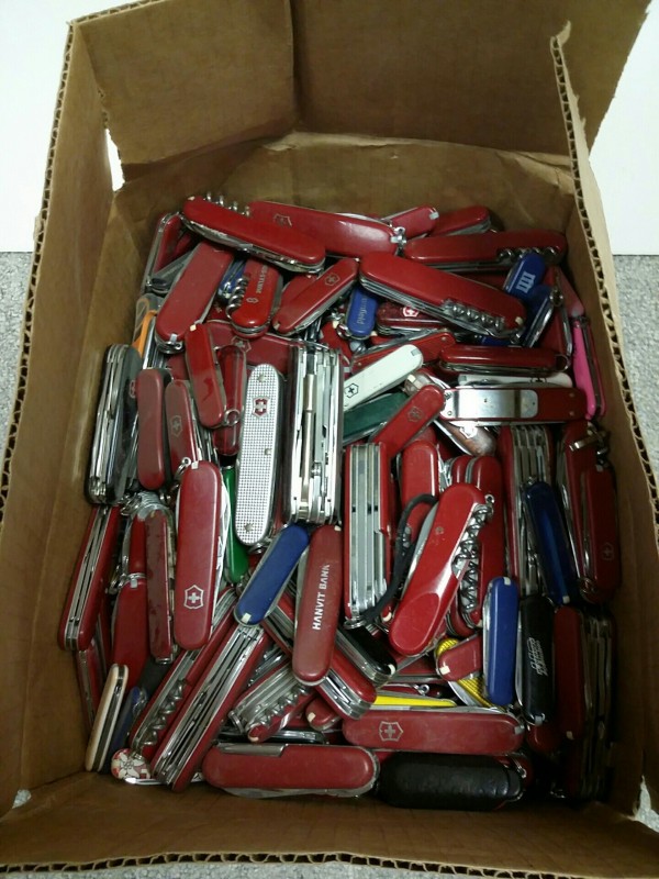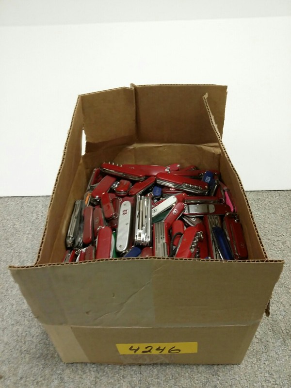 Description: 1 each box consisting of miscellaneous Victorinox and Wenger Swiss Army pocket knives.