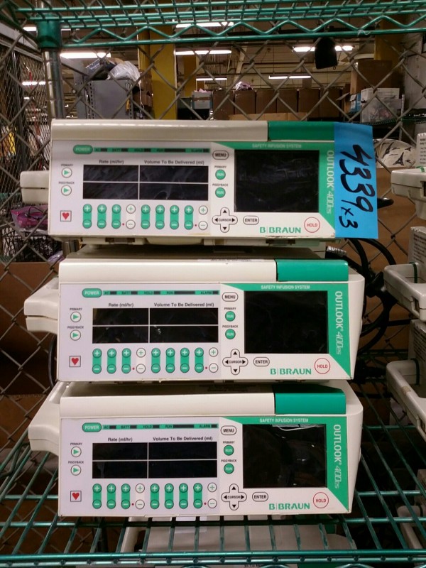 Description: Lot consisting of 3 each Braun Outlook 400es infusion IV pumps. These units were part of an upgrade and may, or may not function properly.