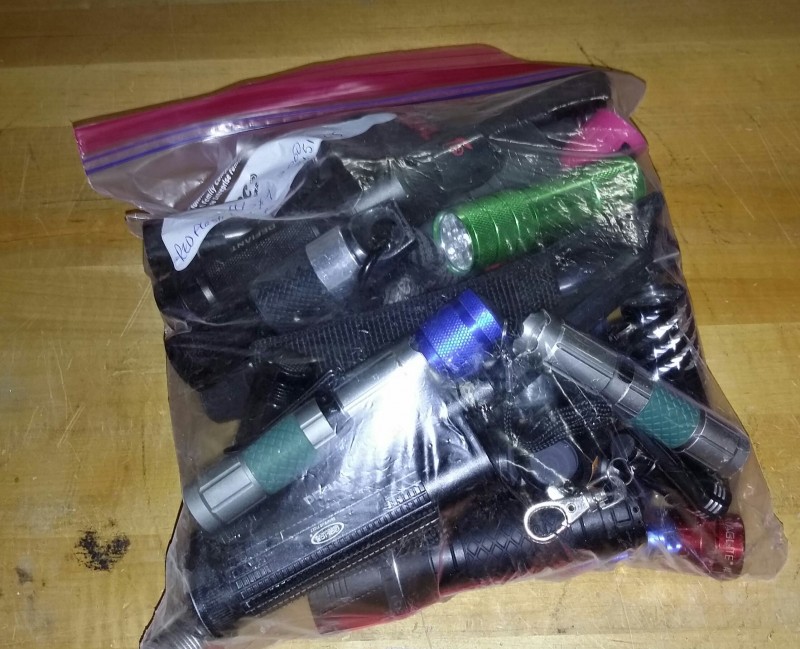 Description: 1 each gallon size Ziploc bag of miscellaneous types of flashlights.