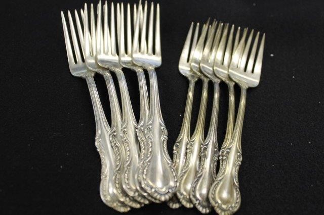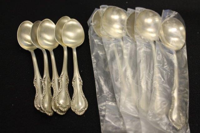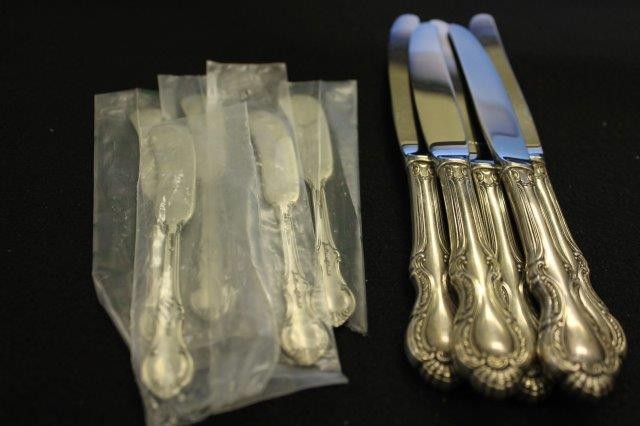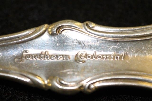 STERLING FLATWARE SOUTHERN COLONIAL PATTERN; 5 DINNER FORKS 249.0g, 5 SALAD FORKS 173.1g, 5 TEA SPOONS 154.9g, 5 SOUP SPOONS 186.0g, 5 STERLING HANDLED TABLE KNIVES 77.7g, 5 BUTTER KNIVES 135.0g