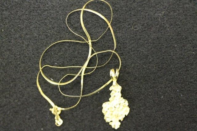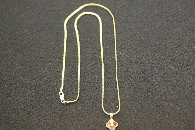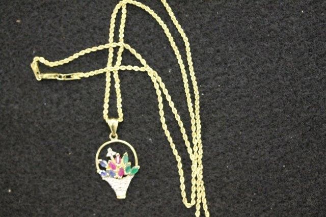 6 - 14K GOLD NECKLACES; 14K YELLOW GOLD W/ GARNET PENDANT 7.8g, 14K YELLOW GOLD HERRINGBONE CHAIN W/ MONOGRAM PENDANT 6.6g, 14K YELLOW GOLD HERRINGBONE W/ NUGGET STYLE PENDANT 4.5g, 14K YELLOW GOLD CHAIN W/ FLOWER BASKET PENDANT AND MULTI COLORED STONES 4.4g, 14K GOLD NECKLACE W/ PENDANT 2.8g, 14K GOLD NECKLACE W/ LOCKET 1.2g