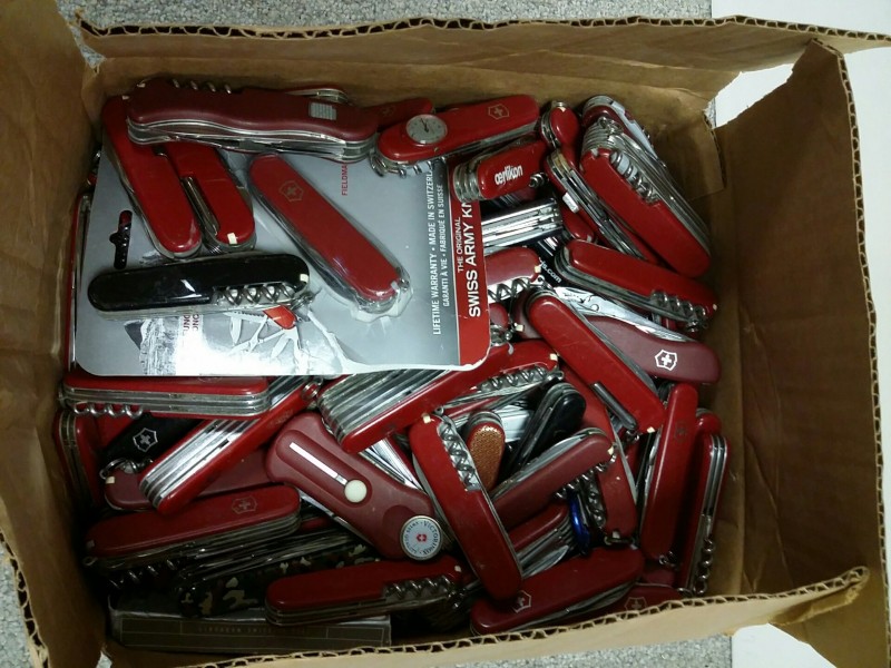 Description: 1 each box consisting of miscellaneous Victorinox and Wenger Swiss Army pocket knives.