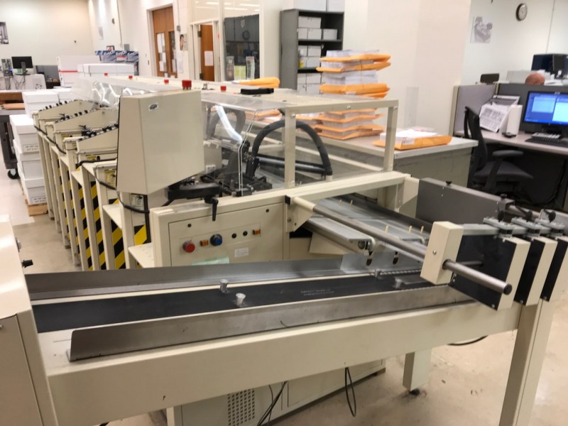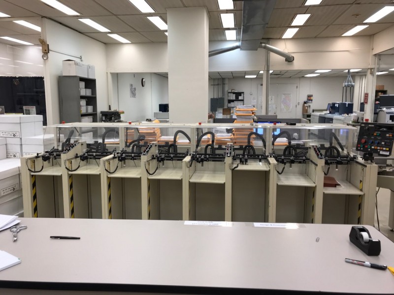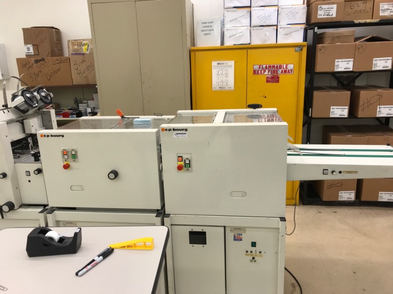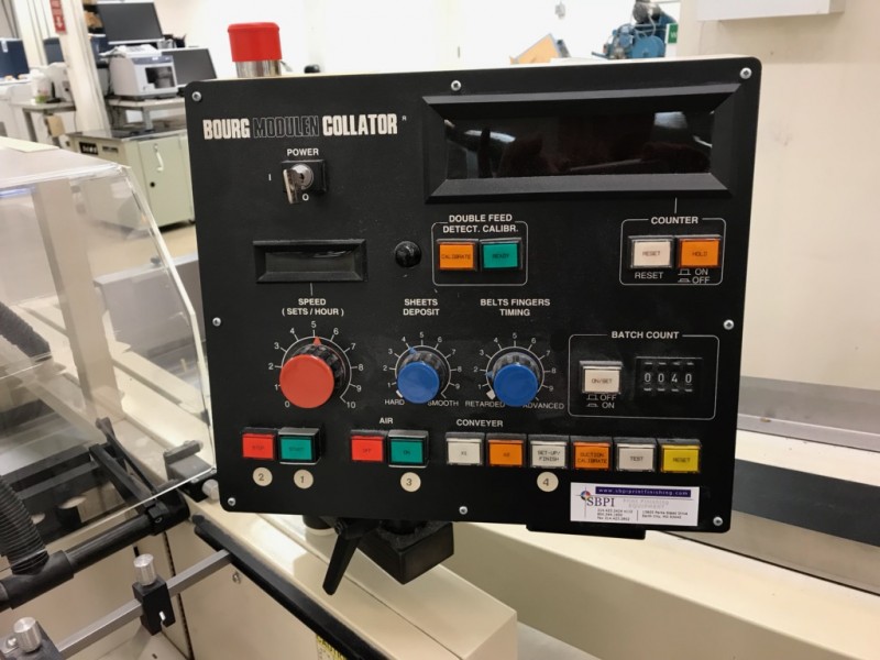 Description: Bourg Modulen Collator Model S. This unit collates, stitches, and folds. The unit is divided into seperate modules which all have different serial numbers and comes with the manual and parts book.