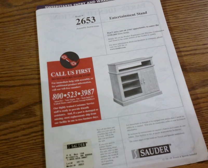 Description: 1 each Sauder entertainment stand with components.