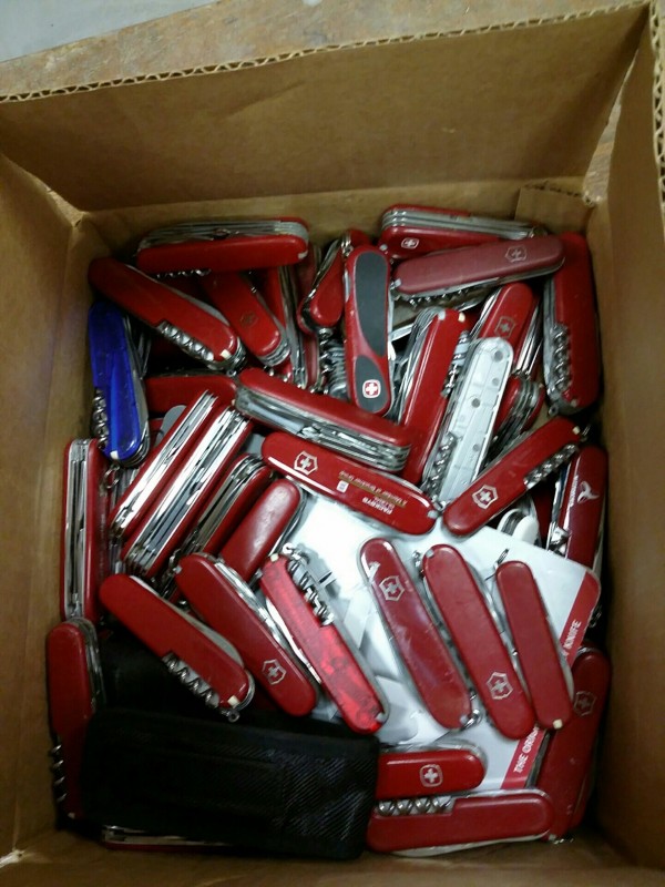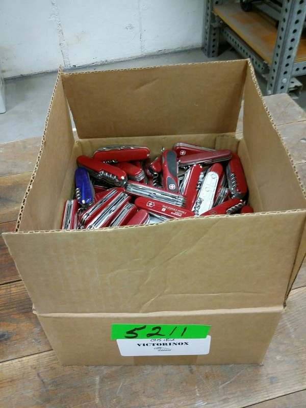 Description: 1 each box consisting of miscellaneous Victorinox and Wenger Swiss Army pocket knives.