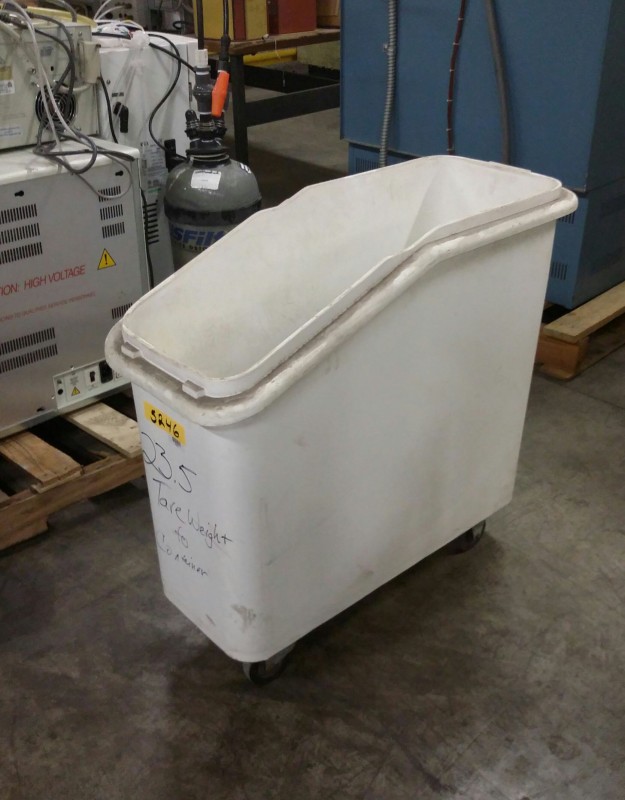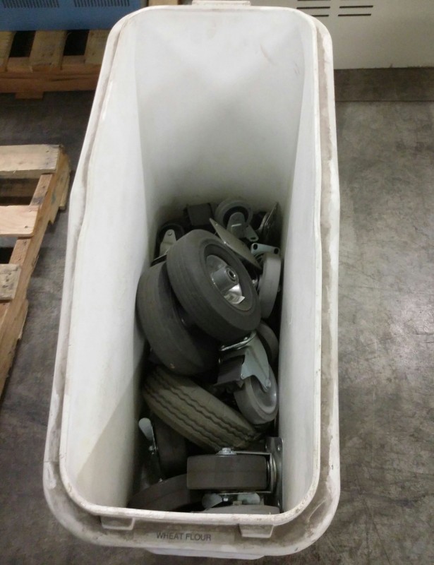 Description: 1 each bin on wheels used for storing flour/sugar in a bakery with miscellaneous wheels inside.