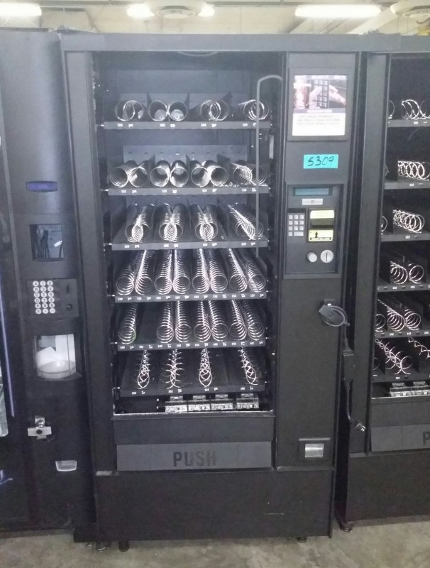 Description: 1 each spiral snack vending machine. This unit is missing the glass in the door.