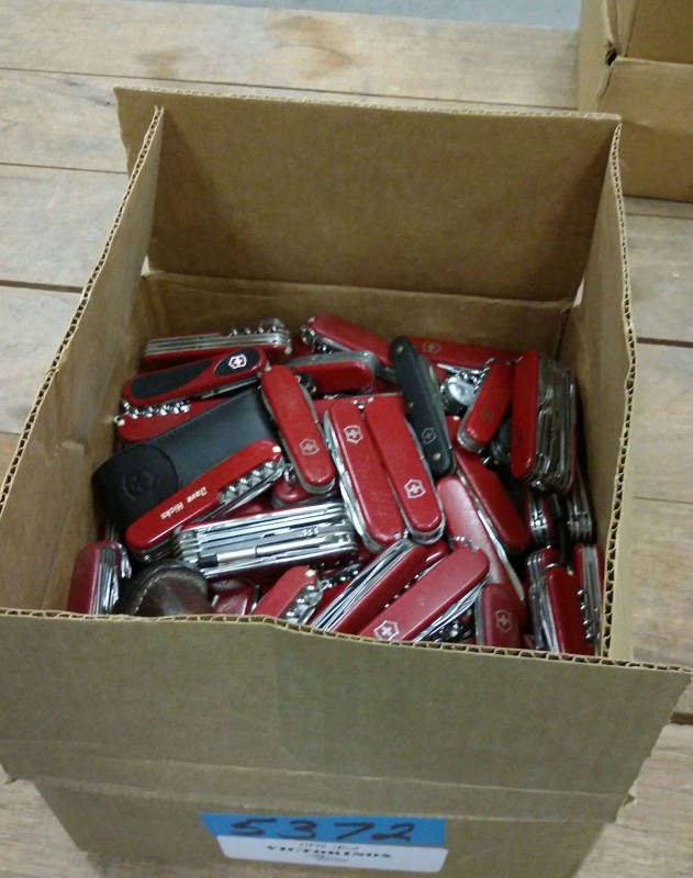 Description: 1 each box consisting of miscellaneous Victorinox and Wenger Swiss Army pocket knives.