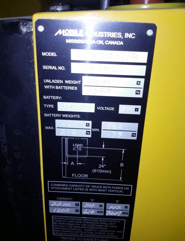 Description: 1 each Mobile Industries forklift model RTS 22-118.