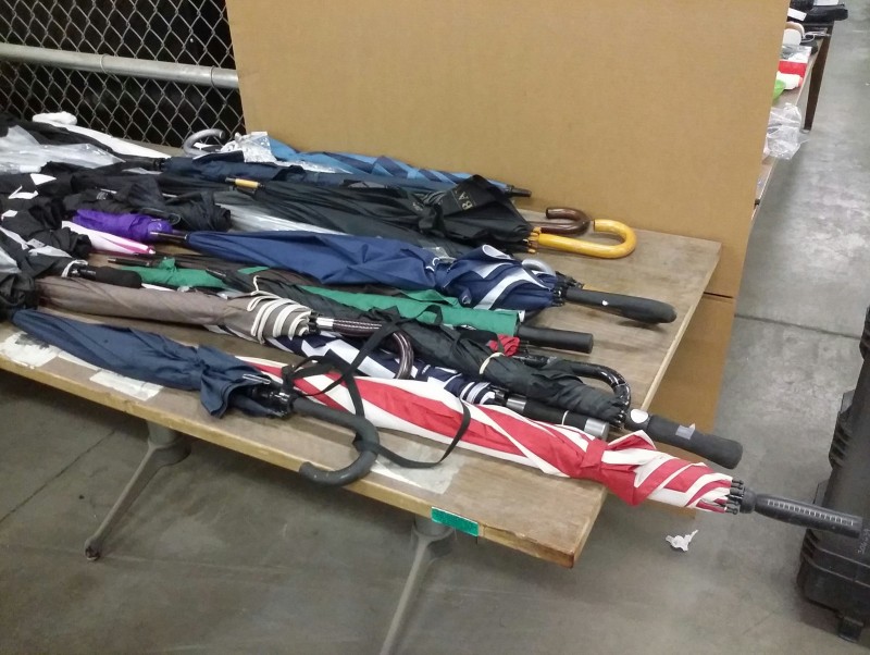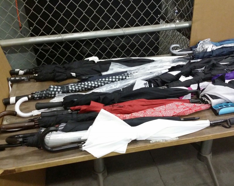 Description: 1 each table lot consisting of miscellaneous umbrellas. The table isn't included in this lot.