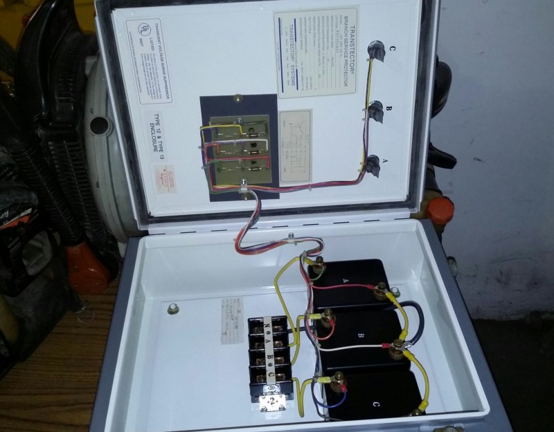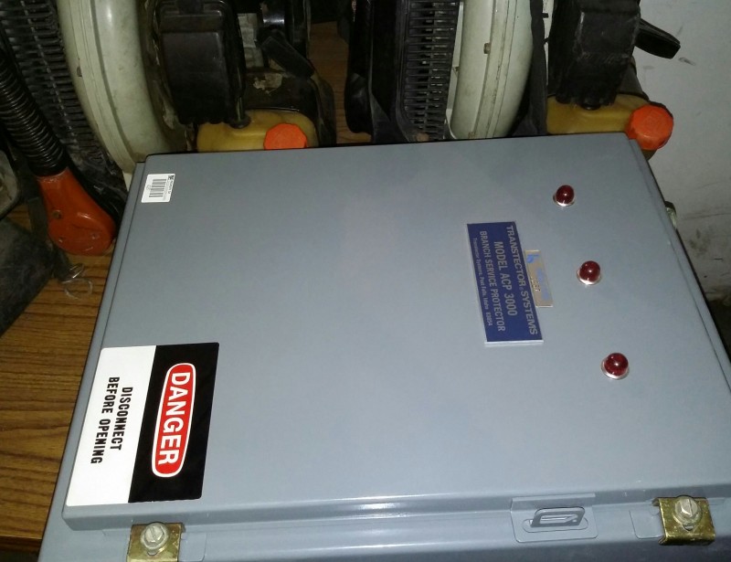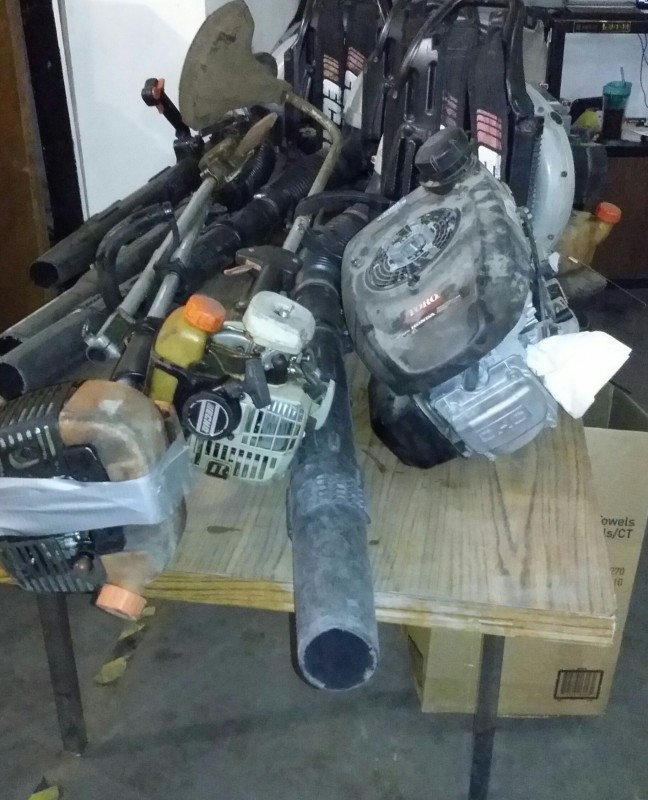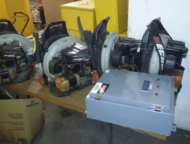 Description: Table lot of miscellaneous back pack blowers, weed trimmers, and 1 each Transtector Systems Model ACP 3000 branch service protector.