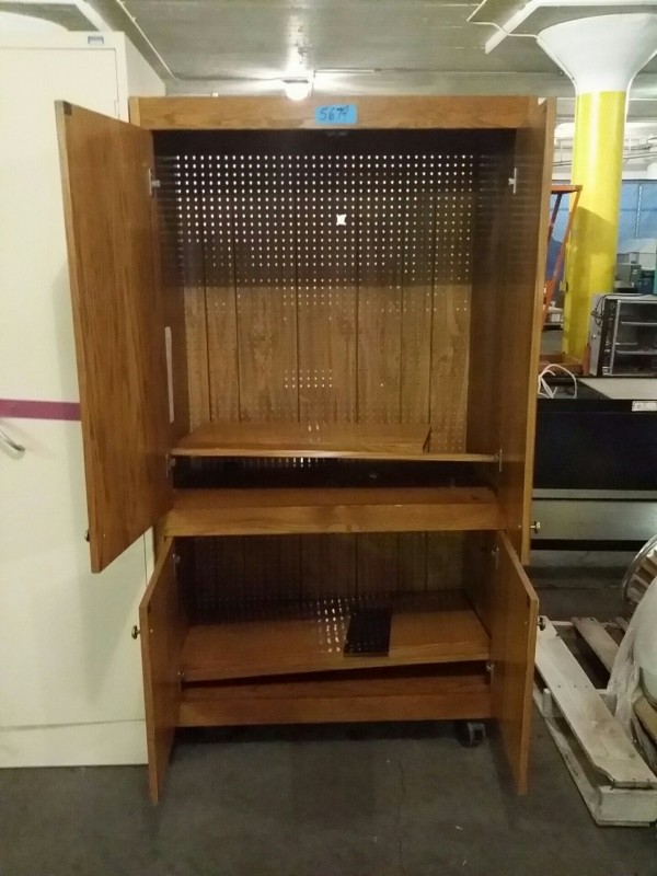 Description: 1 each entertainment center cabinet. The cabinet is mobile, has wheels on it.