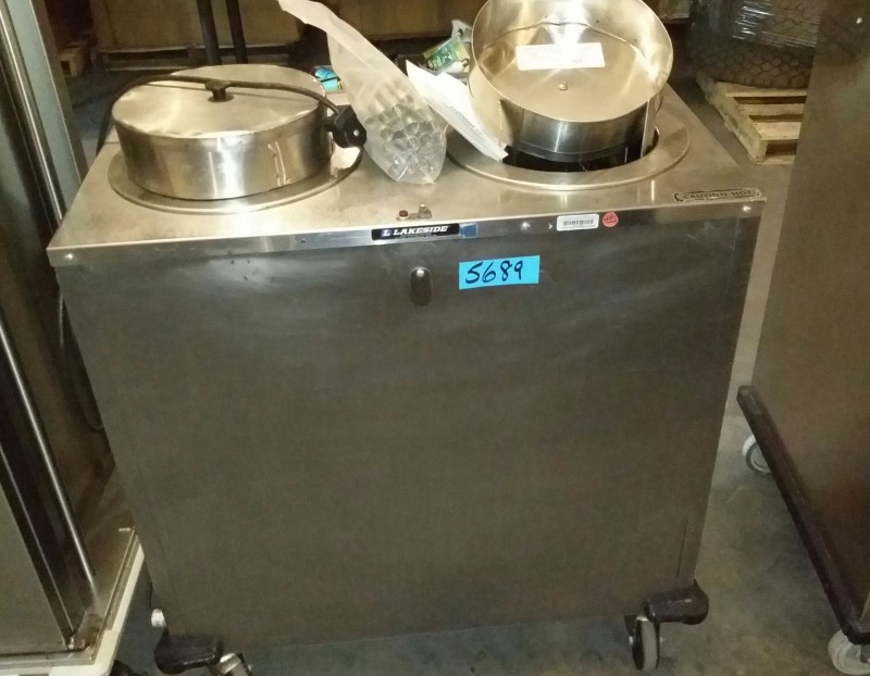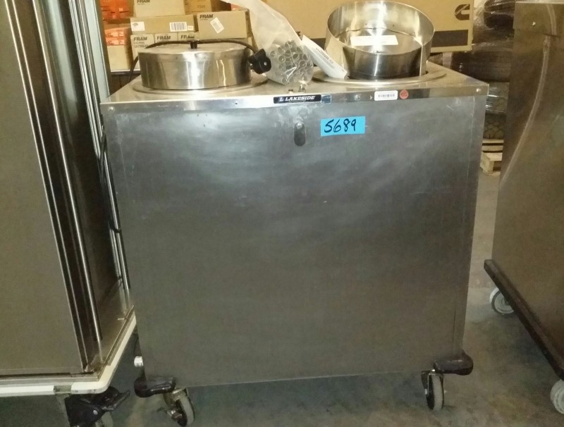 Description: 1 each Lakeside stainless steel two stack mobile heated dish dispenser.