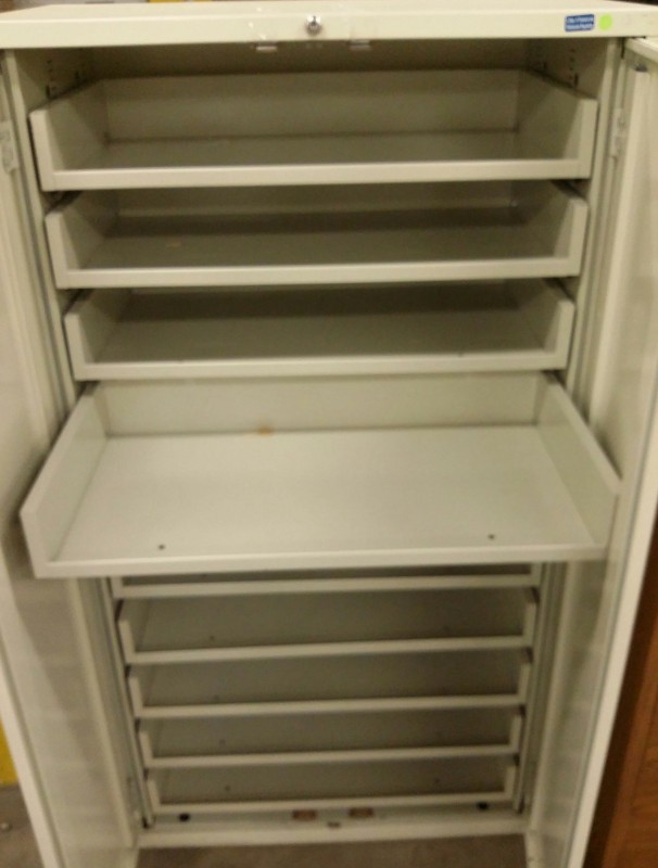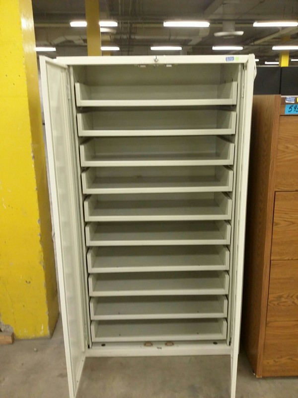 Description: 1 each metal storage cabinet with pullout shelves.