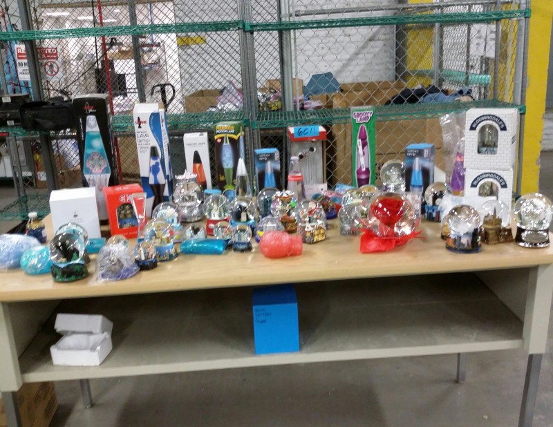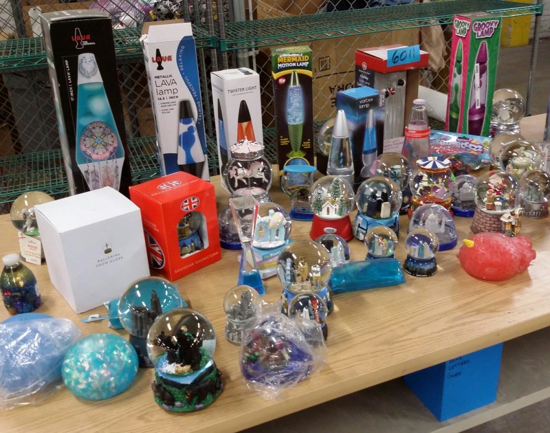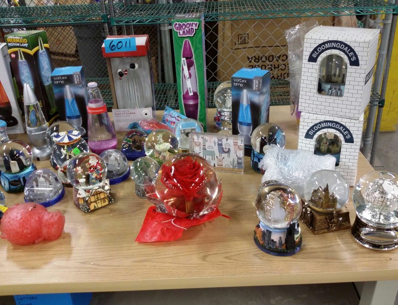 Description: Table lot consisting of miscellaneous snow globes and other. This lot will require the winning bidder upon pick/up to bring with them their own boxes, bins, and packing material for this lot. Warehouse staff will not provide these items when picking this lot up.