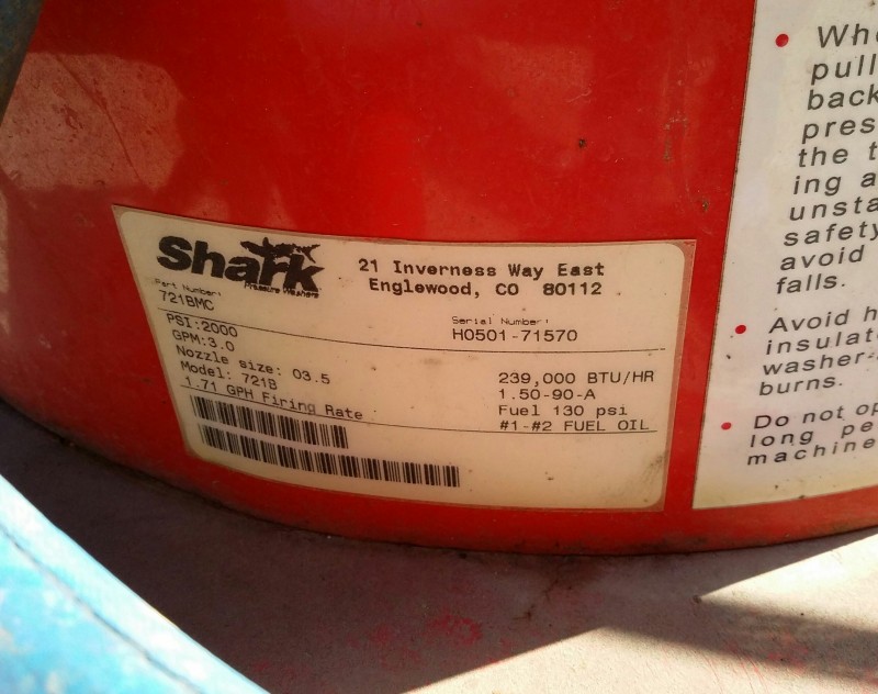 Description: 1 each Shark heated pressure washer. Motor spins free, not locked up.