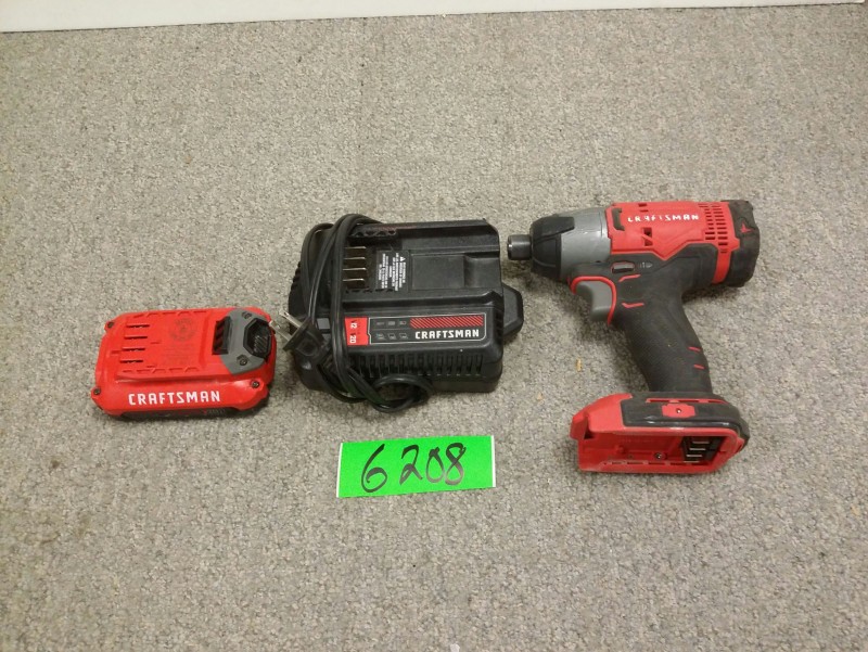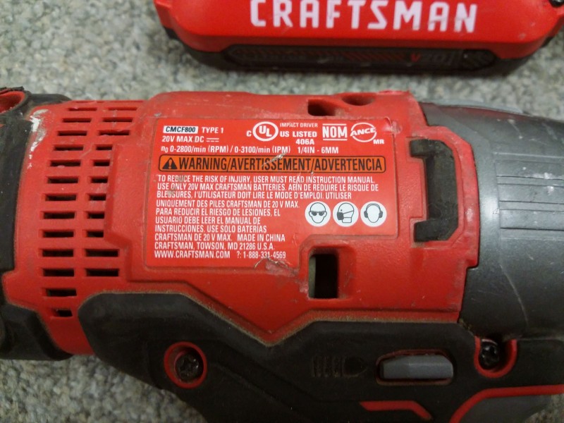 Description: 1 each Craftsman 1/4 inch 20 volt model CMCF800 impact drill, battery and charger.