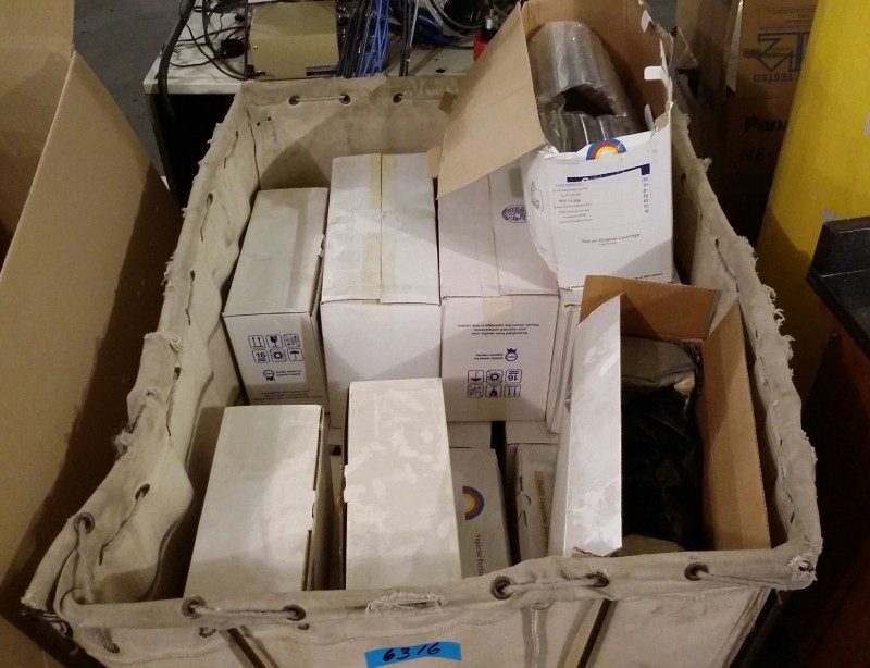 Description: 1 each laundry cart/bin with miscellaneous toner cartridges inside.