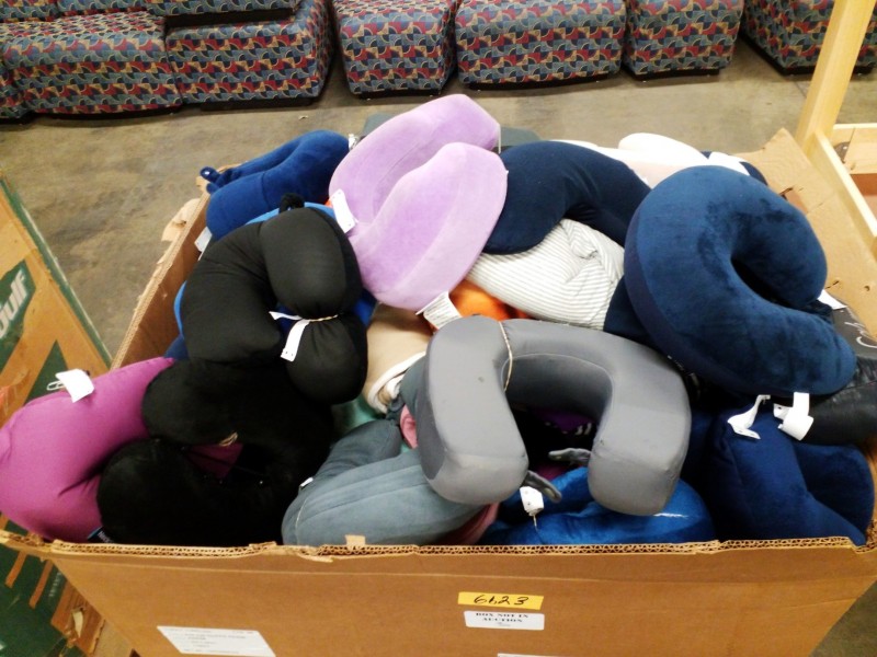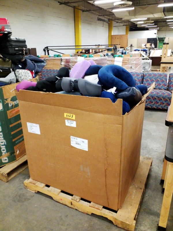 Description: 1 each box consisting of miscellaneous neck pillows, pillows and blankets. The box isn't included in this auction. The winning bidder of this auction will need to remove the contents and leave the box at the warehouse.