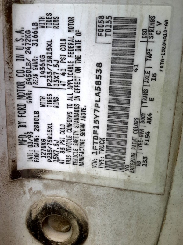 33293 - 1993 Ford F150 1/2 ton P/U 2WD 6 Cylinders Y 4.9L MFI - Mileage 171,506