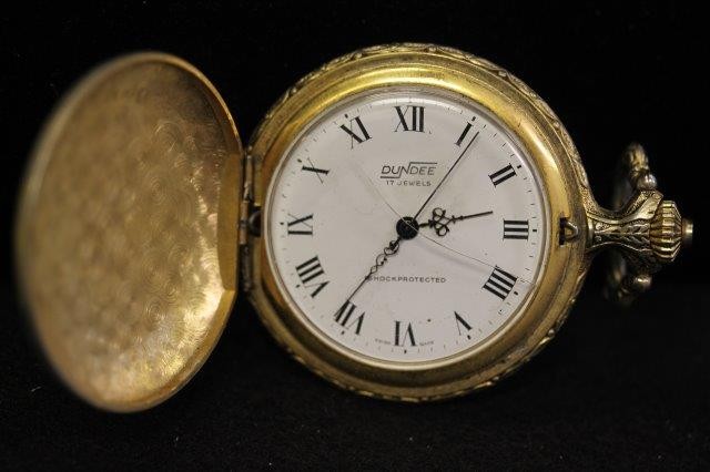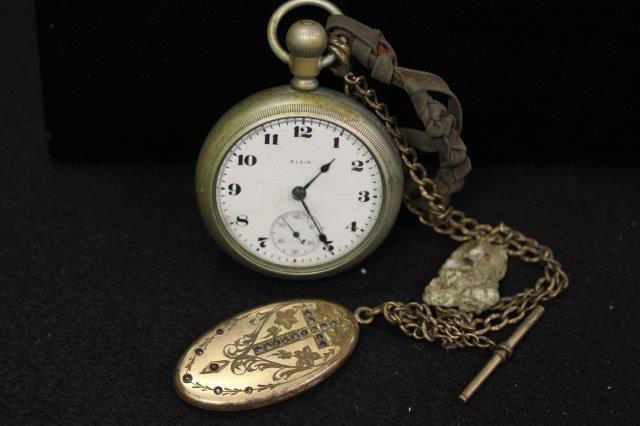 5 POCKET WATCHES: ELGIN GF 15J (RUNNING) BROKEN CRYSTAL W/WATCH CHAIN; ELGIN SILVEROID CASE (NOT RUNNING) W/CHAIN & GF FOB/LOCKET; SENTINEL (NOT RUNNING); WESTCLOX POCKET BEN (RUNNING); DUNDEE 17J (RUNNING)