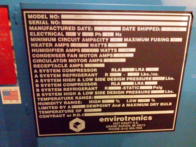 Description: 1 each Envirotronics enviornmental testing chamber model SH8.