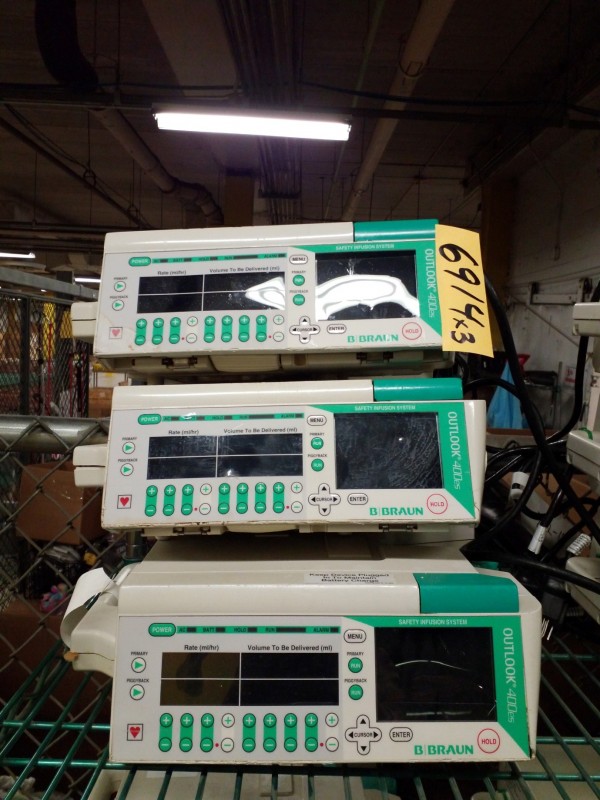 Description: Lot consisting of 3 each Braun Outlook 400es infusion IV pumps. These units were part of an upgrade and may, or may not function properly.