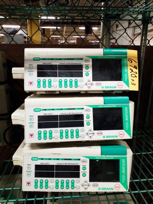 Description: Lot consisting of 3 each Braun Outlook 400es infusion IV pumps. These units were part of an upgrade and may, or may not function properly.