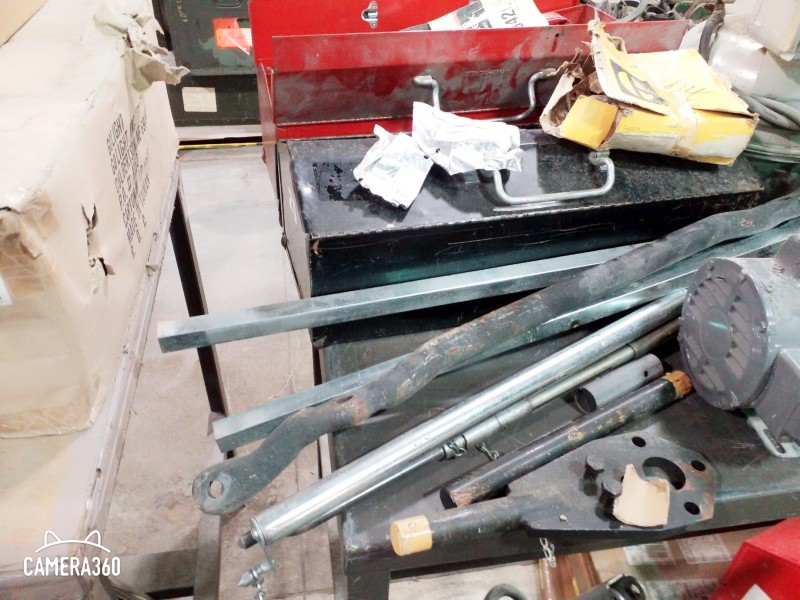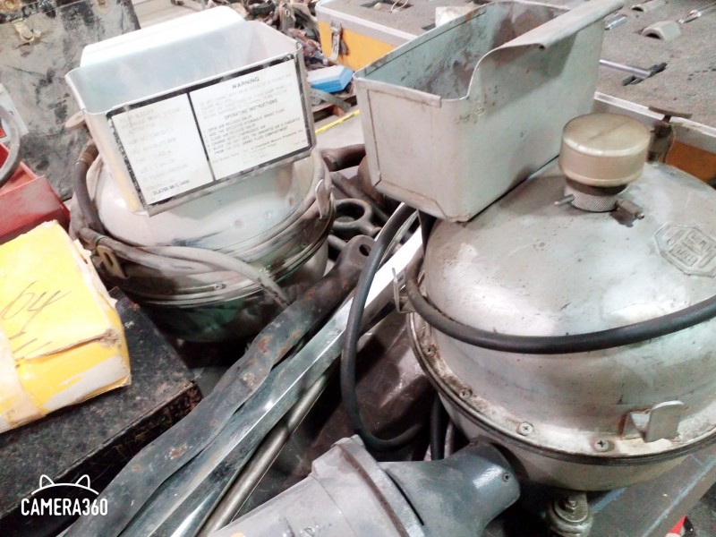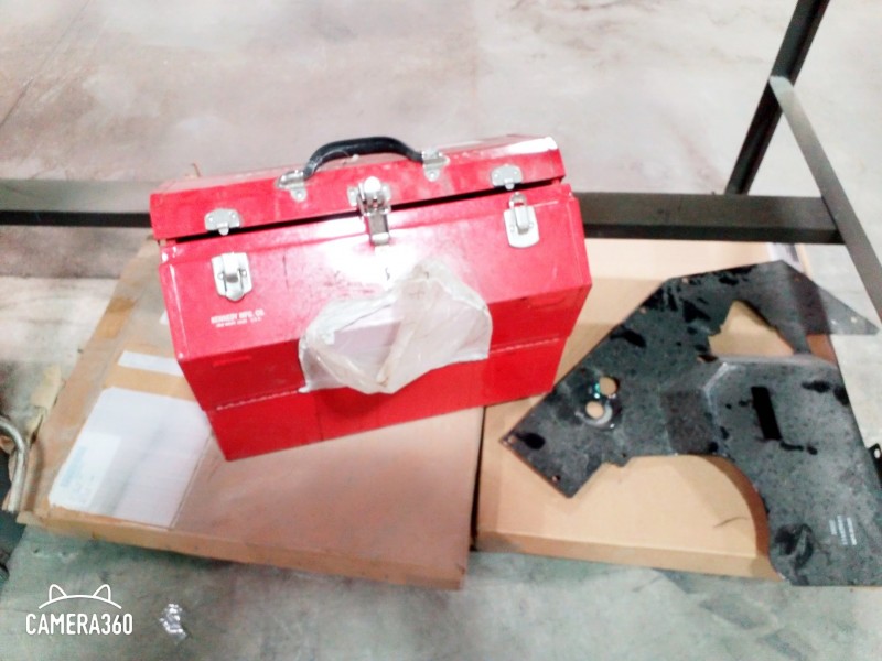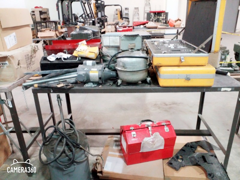 Description: Table lot consist of Hydraulic brake filler and bleeder system - 2 each, Bushing/Bearing install/removal kit - 2 each, tool boxes - 3 each, Baldor electrical motor - 1 each, Diesel engine shroud - 5 each, other misc. Tools and parts.