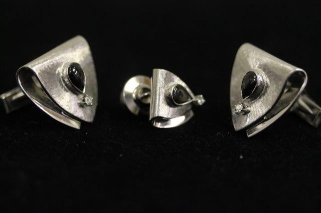 14K CUFF LINKS AND OTHERS; 14K WHITE GOLD CUFF LINKS W/MATCHING TIETACKS 17.5G, 6 MISC PR CUFF LINKS, 15 SHIRT STUDS, 2-TIE TACKS
