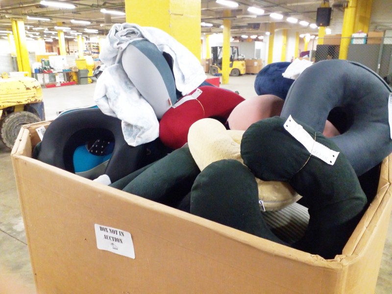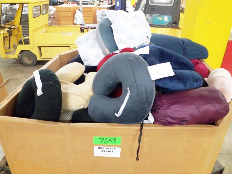 Description: 1 each big box consisting of miscellaneous neck pillows, pillows and blankets. The box isn't included in this auction. The winning bidder will need to remove the contents during pick up.