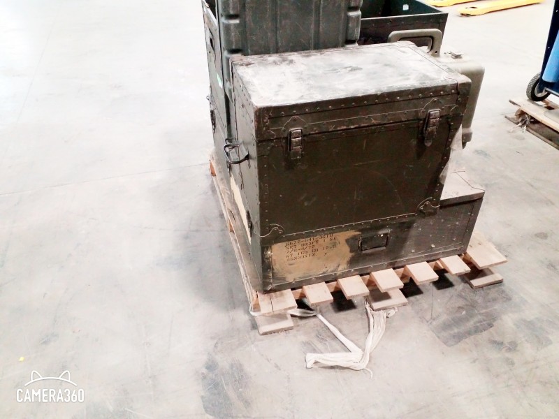 Description: Pallet of Shipping/Storeage boxes - 9 each. 8 each boxes are green. 1 each box is blue. Boxes are made of wood, plastic, and metal. Various sizes of boxes with the biggest box being 33" x 46" and stands 12" tall.