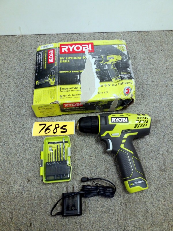 Description: 1 each Ryobi model HP108L 8v drill with charger and bit set new in box.