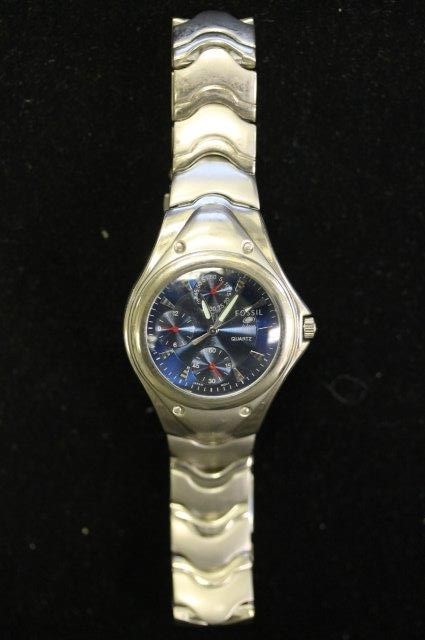 3 GENTS WATCHES; GRUEN 15J RUNNING, FOSSIL (BLUE) SPORT LINE QUARTZ, GENEVA QUARTZ.