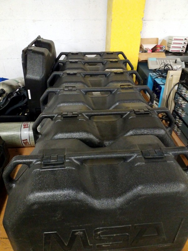 Description: 1 each table lot consisting of MSA air respirator masks, tanks and cases.