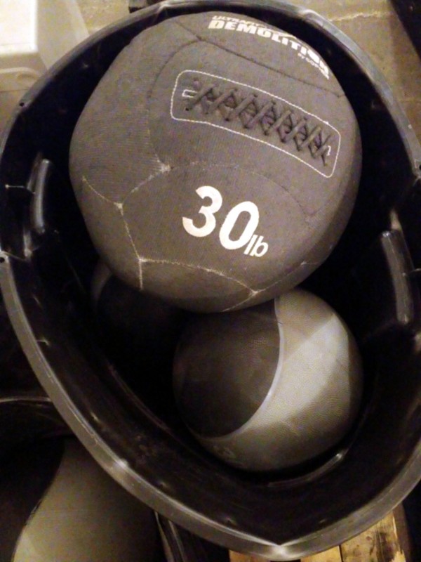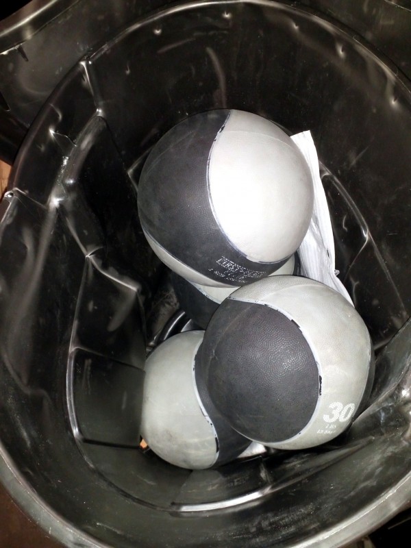 Description: 1 each pallet consisting of 3 each waste cans and miscellaneous medicine balls.